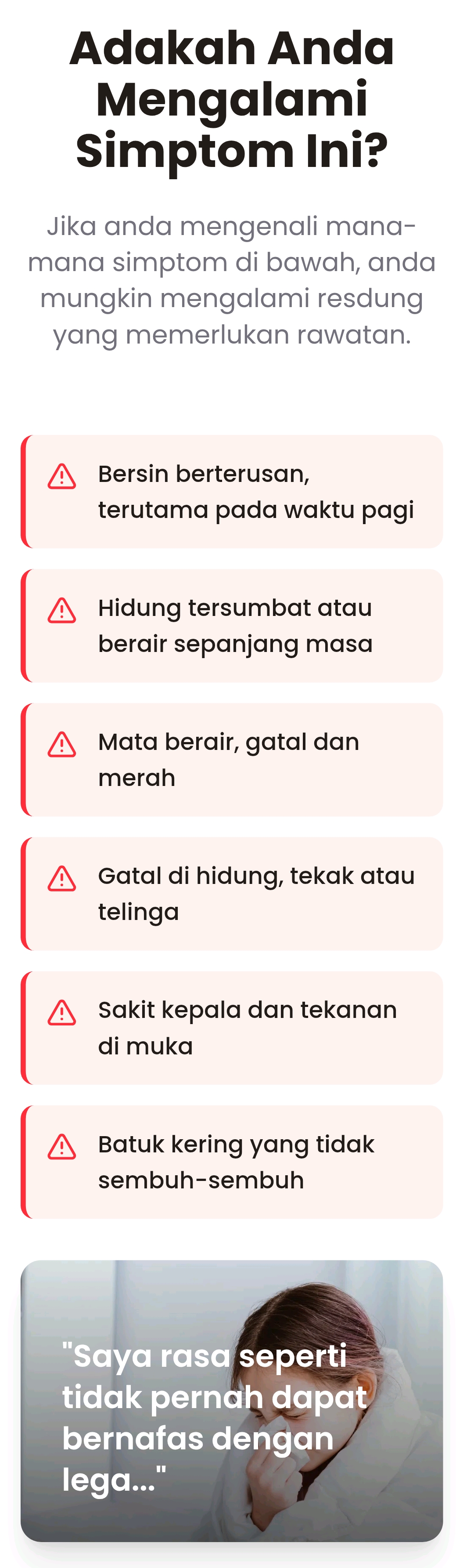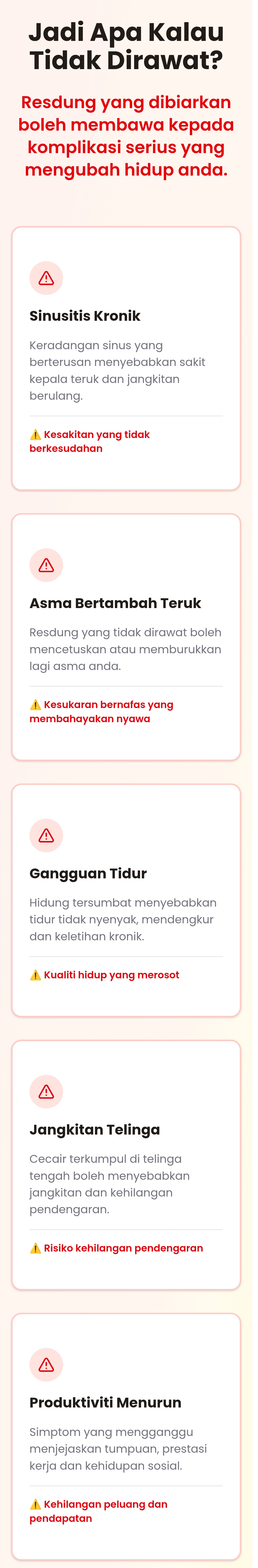Resdung atau Allergic Rhinitis adalah keradangan pada lapisan dalam hidung yang disebabkan oleh tindak balas alahan. Ia bukan sekadar bersin biasa - ia adalah keadaan kronik yang boleh menjejaskan kualiti hidup anda setiap hari.